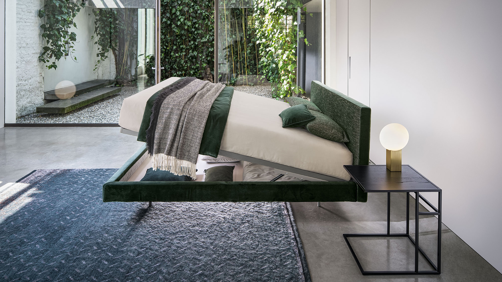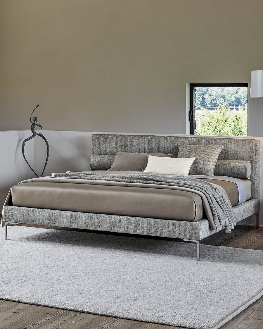 La familia Max incluye varias versiones para adaptarse a distintos estilos: Max Basso, con un aro minimalista y patas estilizadas que realzan la ligereza; Max con aro de 14 cm, icónica por su elegancia geométrica; y Max Alto, un arquetipo atemporal con estética amplia y limpia. También disponible con sistema A-Box®, un práctico canapé integrado que permite almacenamiento y mantiene la cama visualmente suspendida, con un diseño pensado para facilitar la limpieza.