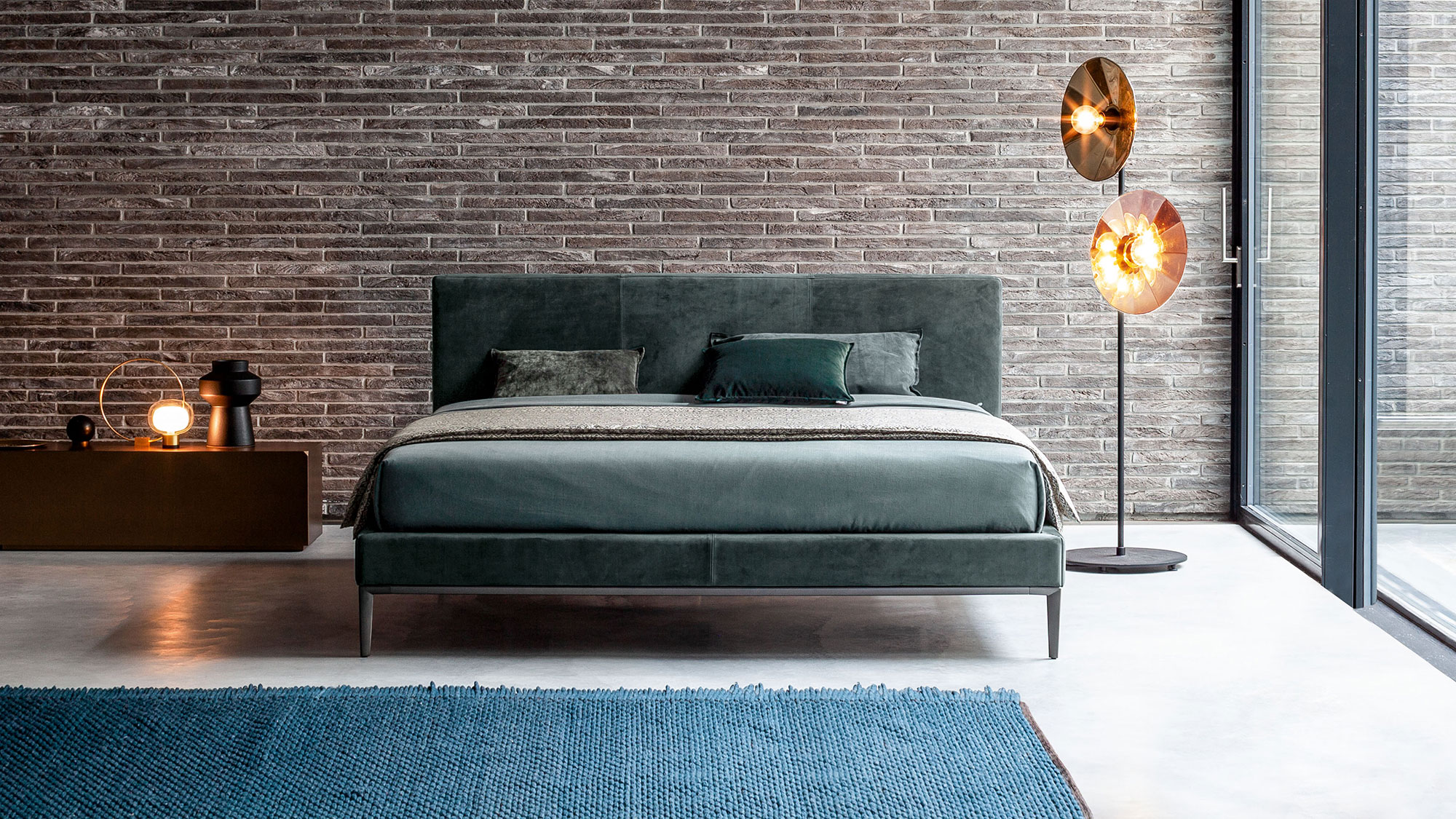 La cama Max de Twils destaca por sus geometrías sólidas y proporciones generosas, reinterpretando la esencia de la cama tapizada contemporánea. Su aro de perfil alto, casi a ras del suelo, transmite estabilidad y presencia, reforzada por unas patas frontales en forma de cono truncado que aportan fuerza y equilibrio visual. El cabecero, de líneas suaves y redondeadas, introduce un contrapunto acogedor que invita al descanso.