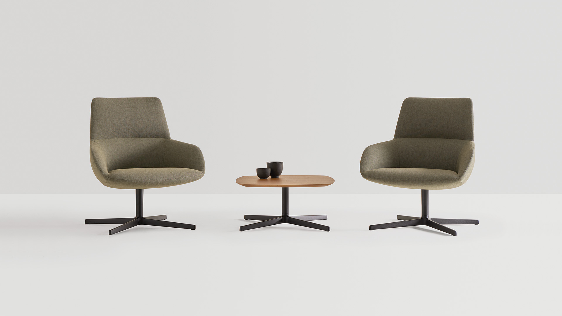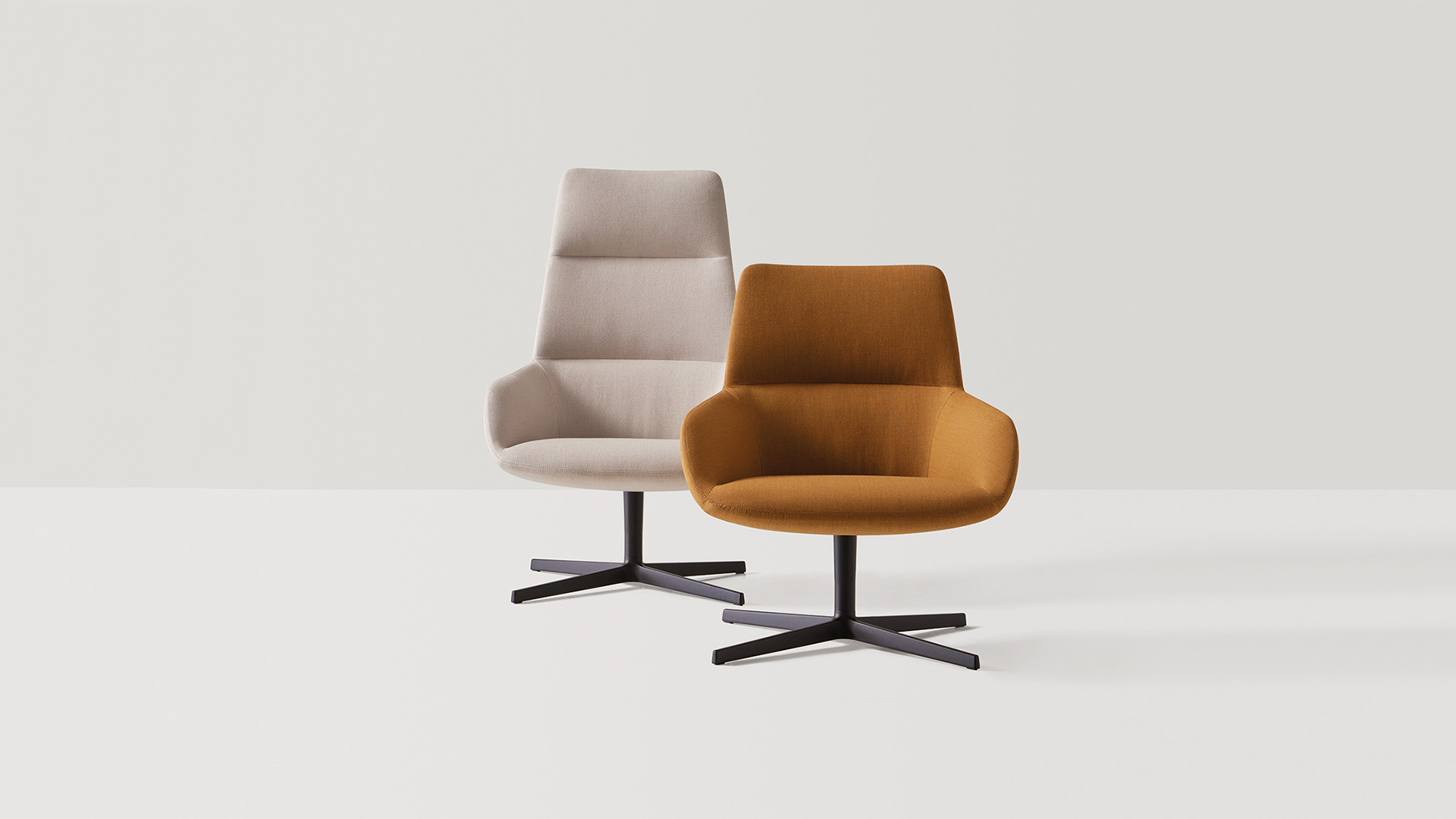 Los sillones incorporan movimiento de giro con retorno automático y se ofrecen con base en aluminio pulido o pintado, aportando un acabado moderno, resistente y visualmente ligero. DUNAS LOUNGE representa la síntesis perfecta entre elegancia, ergonomía y versatilidad.