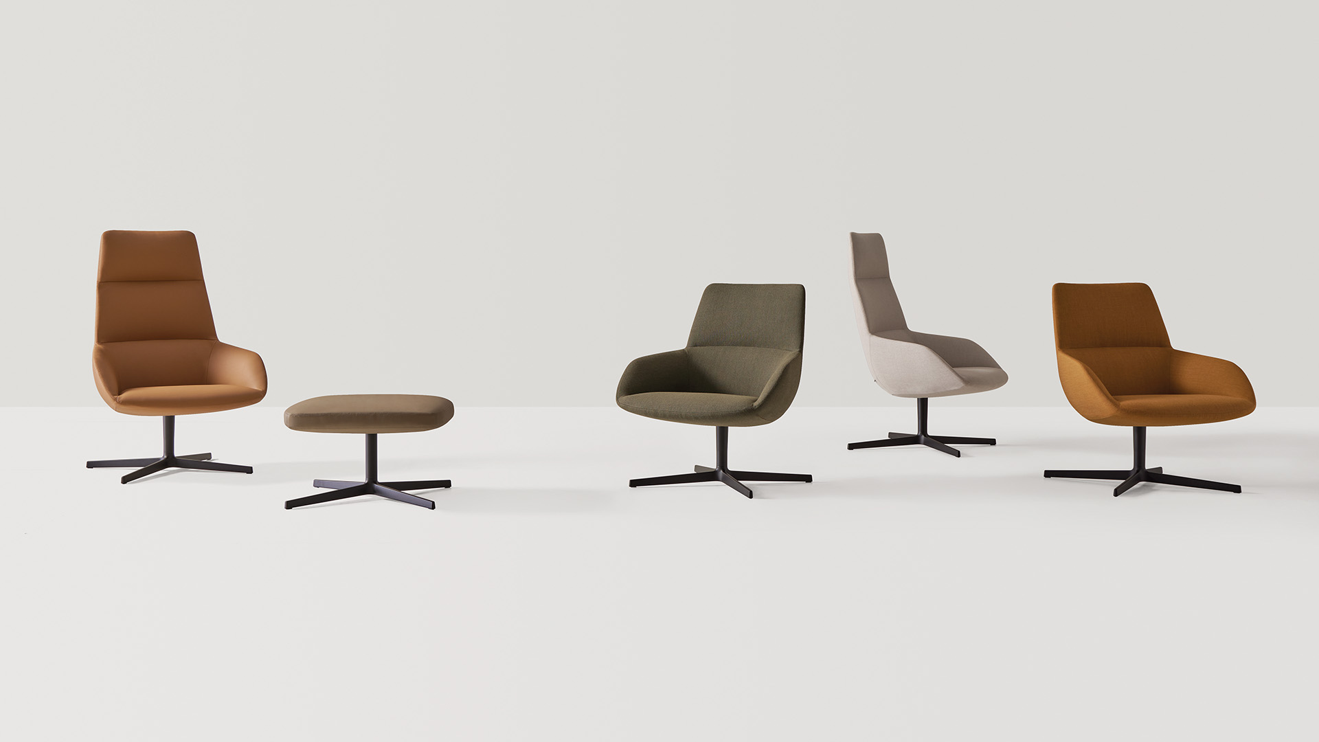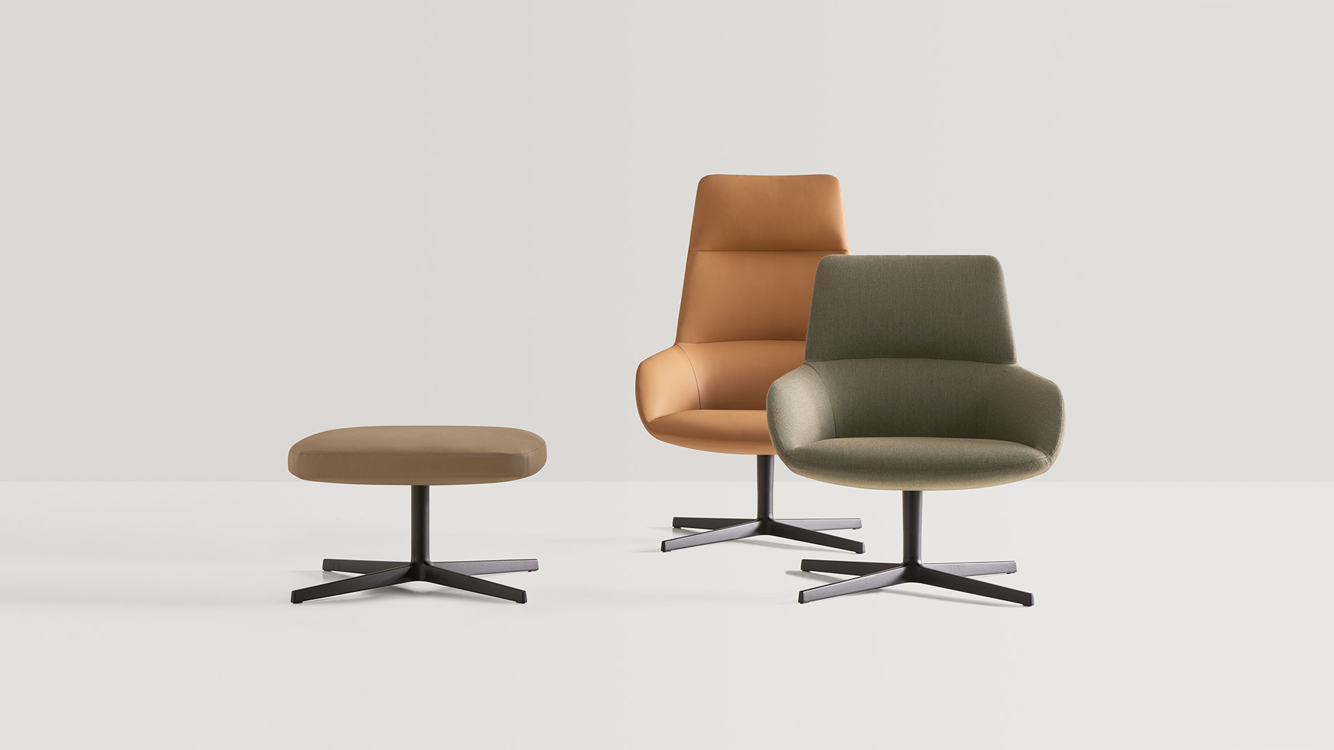 La familia se compone de sillones con respaldo alto o medio, además de un ottoman a juego, permitiendo crear configuraciones completas y armoniosas. Todos los elementos pueden personalizarse con una amplia selección de tejidos y pieles, lo que facilita adaptar el diseño a diferentes estilos y necesidades.
