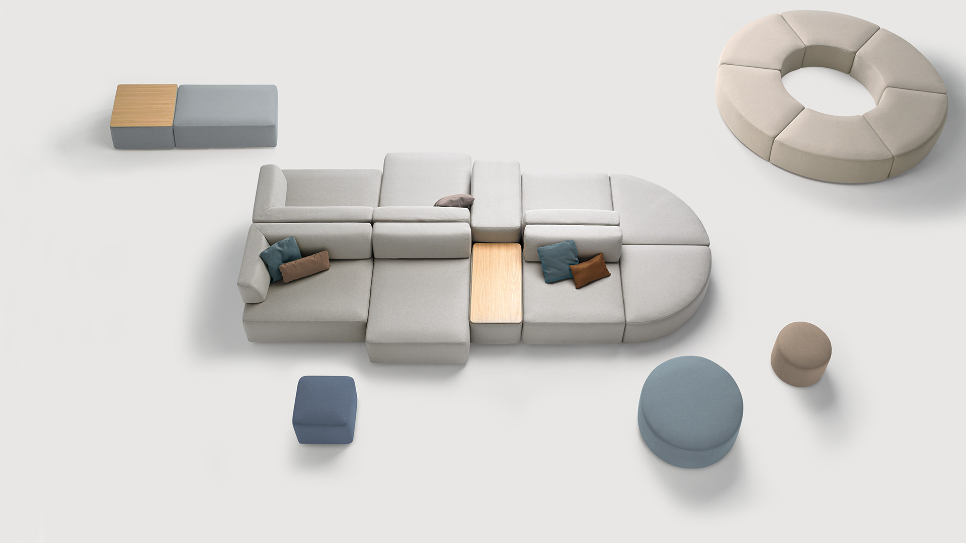 La colección se compone de una amplia variedad de módulos de asiento en múltiples tamaños y formas, que pueden combinarse libremente con respaldos, brazos, mesas auxiliares y accesorios. Esta libertad compositiva convierte a ENTROPY en una herramienta de diseño altamente versátil.