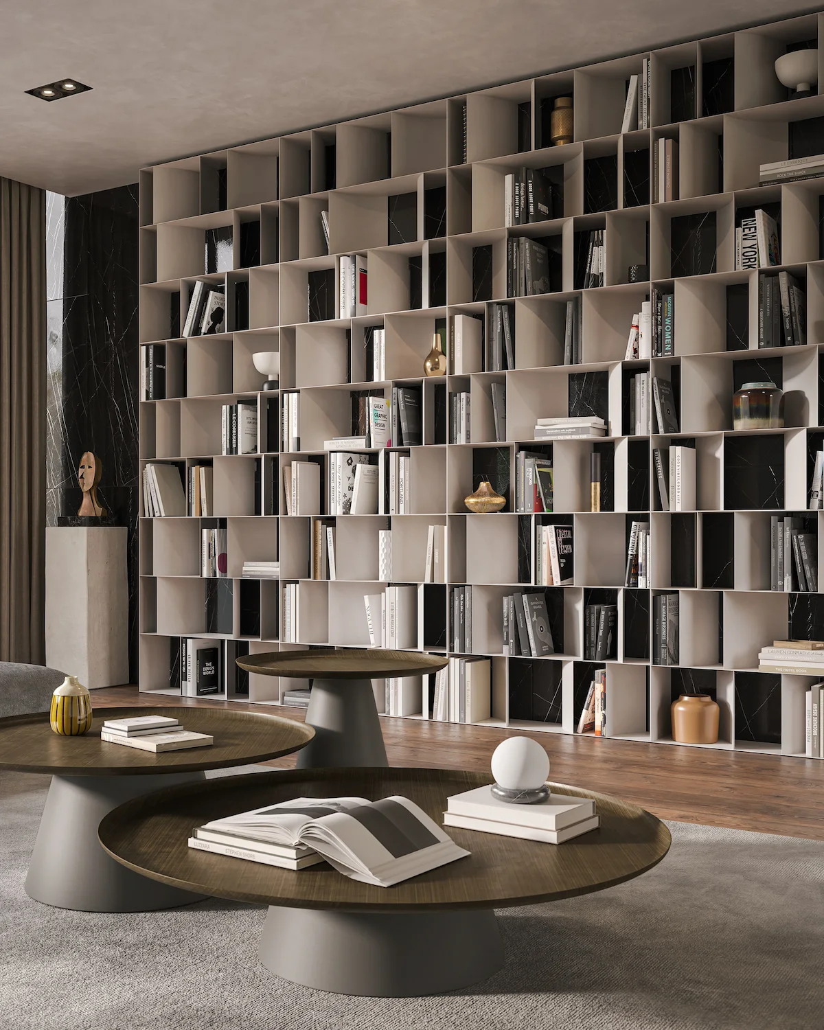 Además, ofrece versatilidad de montaje y acabados personalizables, todo con la calidad artesanal que caracteriza al Made in Italy  . Es ideal para quienes desean un mueble práctico pero artística y decorativamente potente. Su diseño ligero, con elementos inclinados que dejan pasar la luz, la hace ideal como estantería de pared o divisoria de doble cara. Disponible en elegantes acabados metalizados, Nautilus aporta funcionalidad, estilo y un toque sofisticado a interiores modernos.